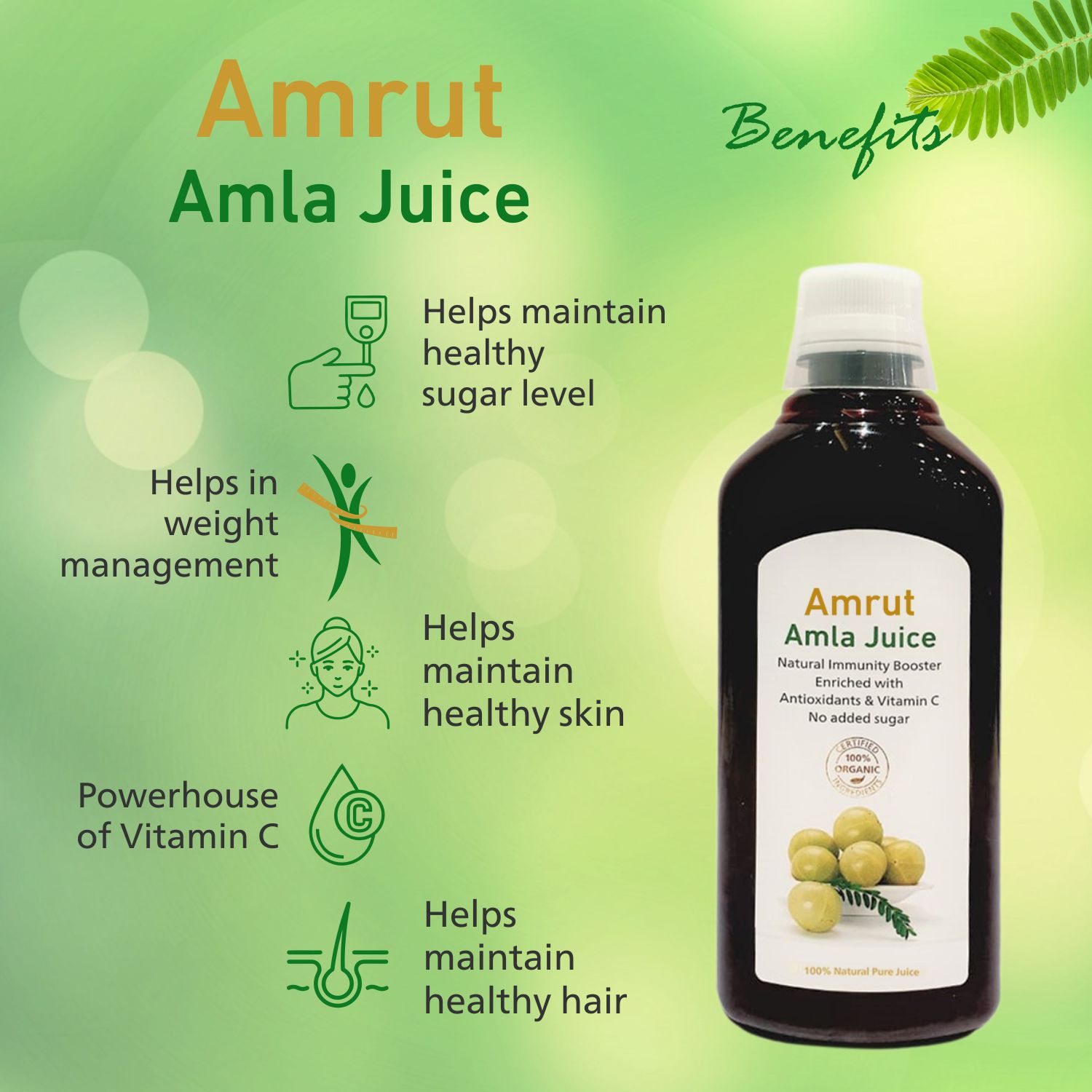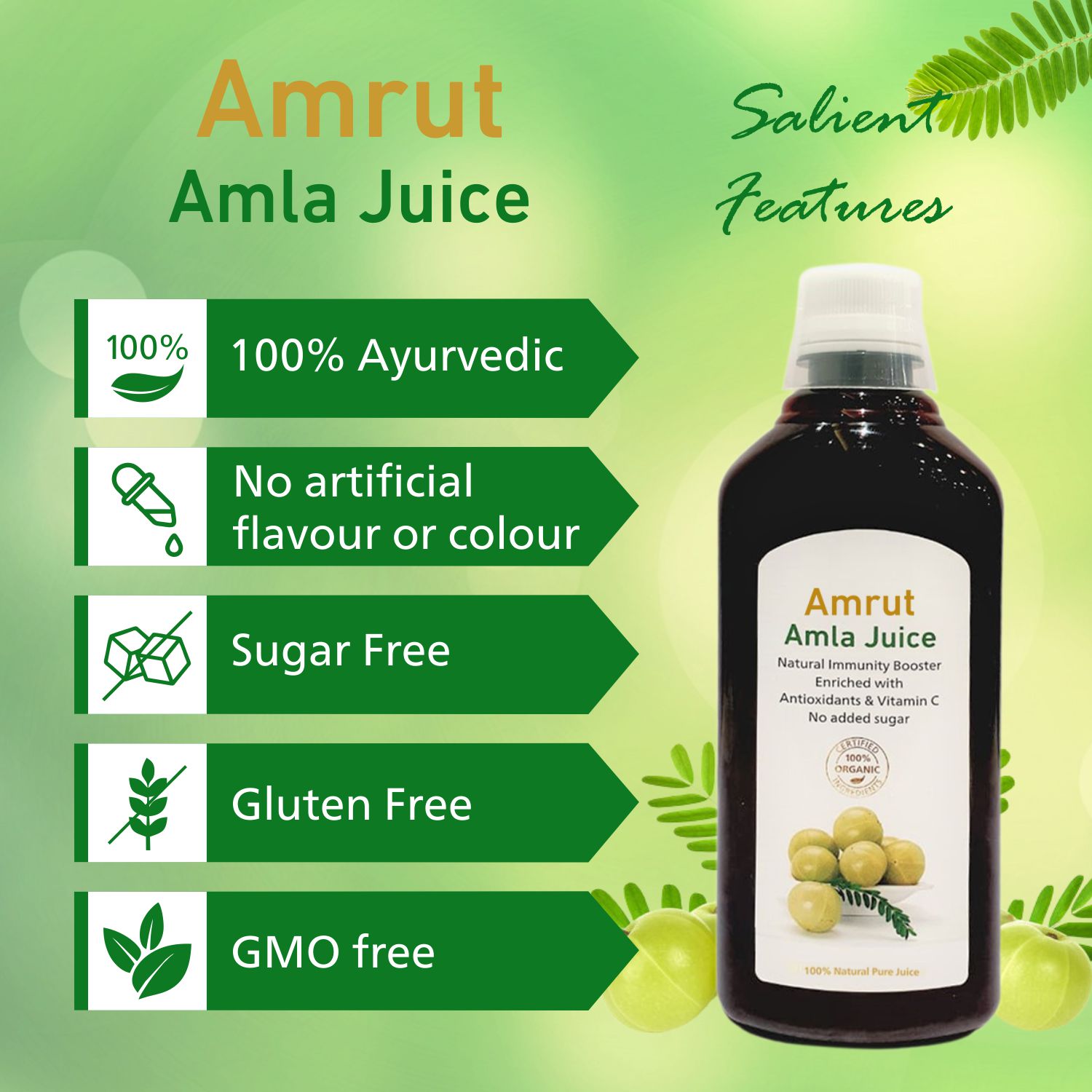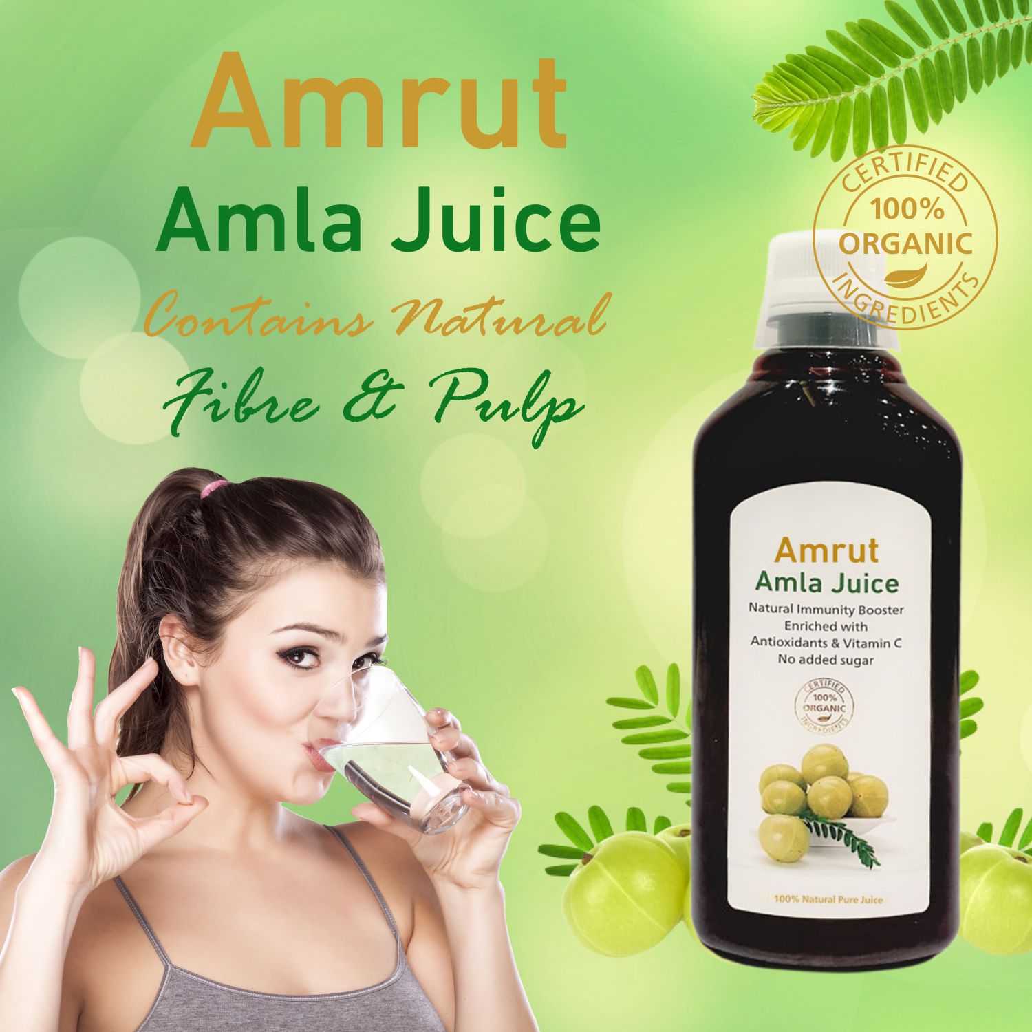 Amrut Amla juice acts as an anti-ageing tonic as well. Additionally, it also carries useful vitamins and minerals for improving vision. Another interesting aspect of an Amrut Amla Juice is that it helps in strengthening the hair from its roots, combats dandruff, premature greying of hair, and restores its natural shine and colour.