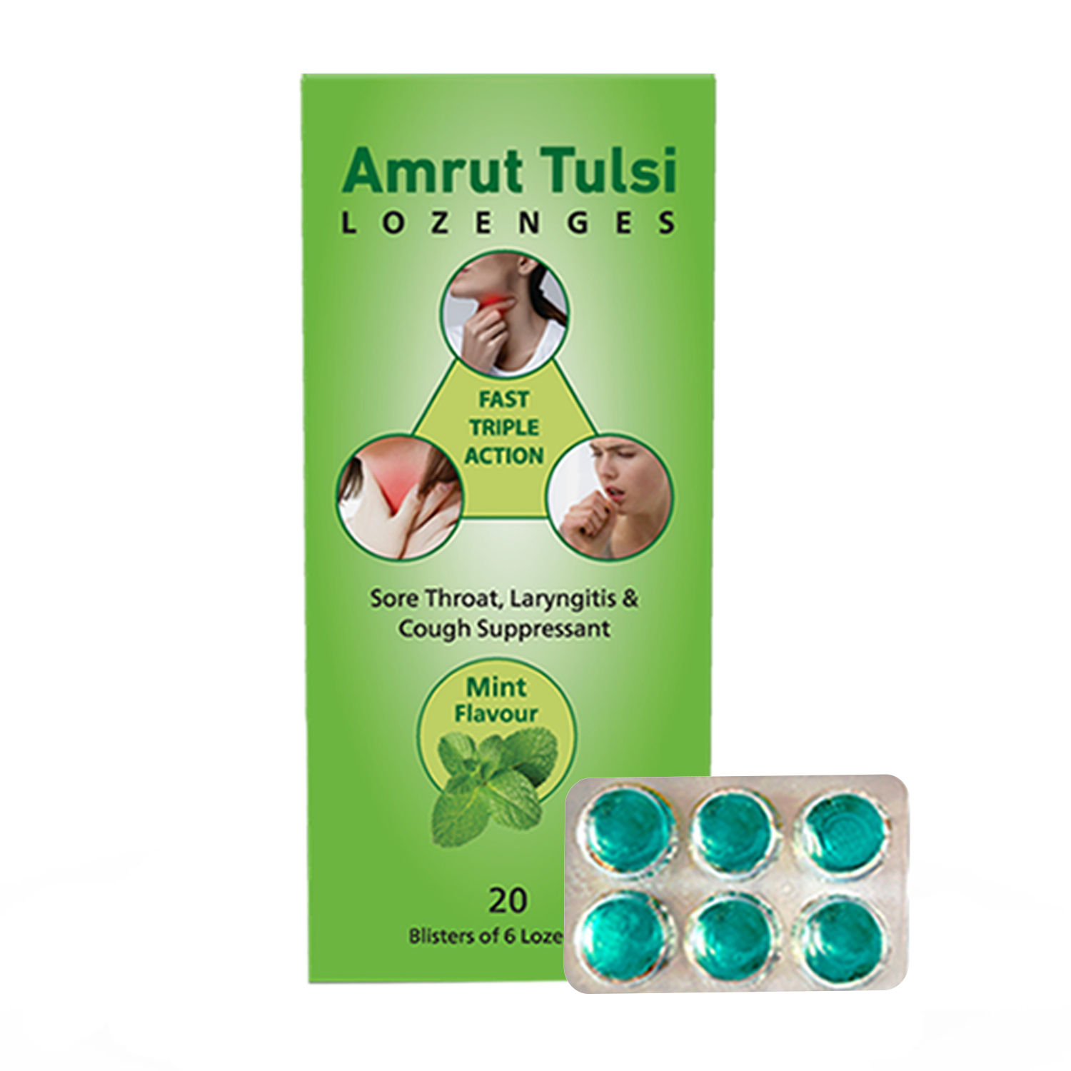 Amrut Tulsi Lozenges ? Mint Flavour are enriched with the natural goodness of Mint, which helps soothe a sore throat by providing an instant cooling effect while relieving irritation and discomfort. Its anti-inflammatory properties help reduce throat swelling, while its antimicrobial action supports the body in fighting viral and bacterial infections. Mint also acts as a natural decongestant and expectorant, helping clear airways, loosen phlegm, and promote easier breathing. The refreshing minty flavour soothes throat irritation and leaves long-lasting fresh breath, helping you recover faster and feel refreshed with every lozenge.