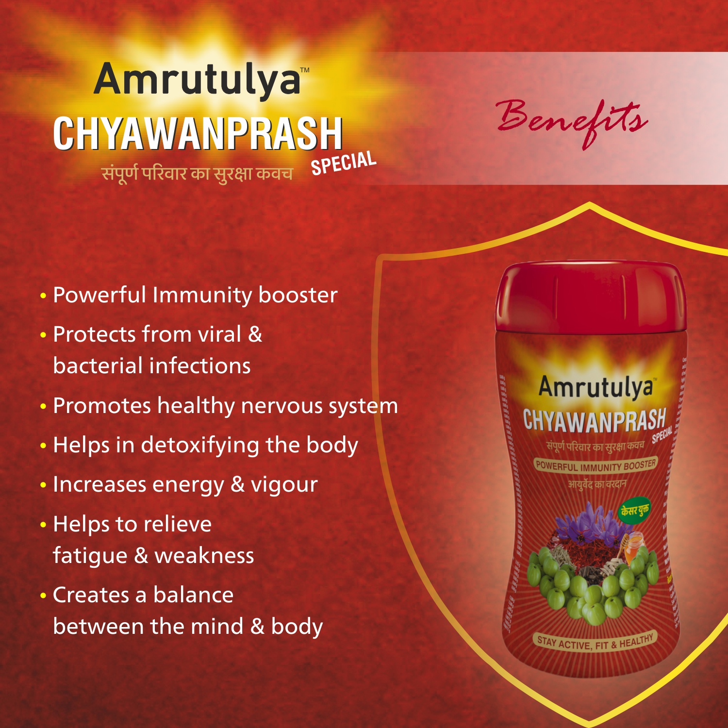 Amrutulya Special Chyawanprash is made with a highly authentic & traditional Ayurvedic process, which consists of fresh Amla processed in pure cow ghee, enriched with Kashmiri Kesar and 47 essential herbs that boost the body?s immunity against viral & bacterial infections and help in fighting common cough, cold & flu-like symptoms.