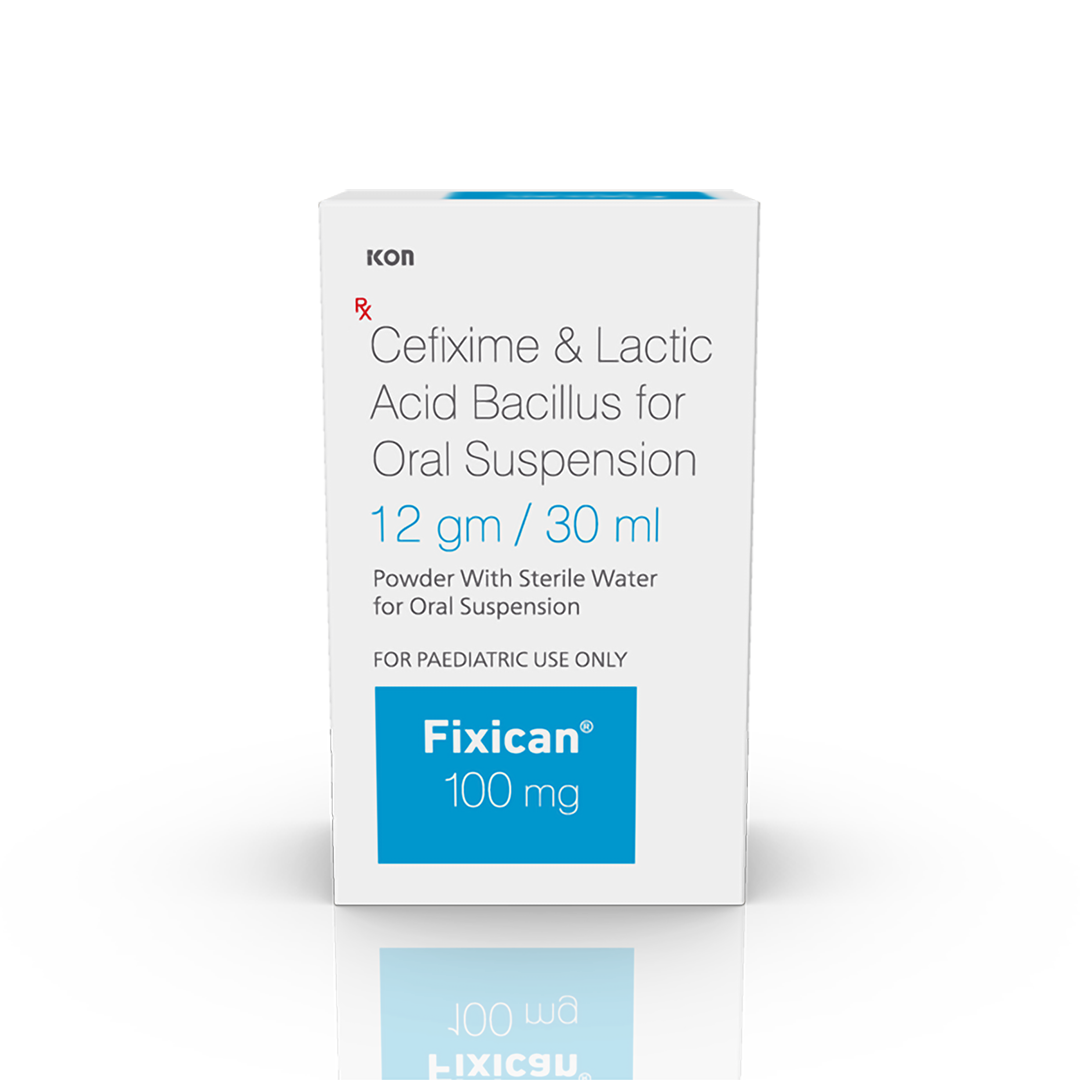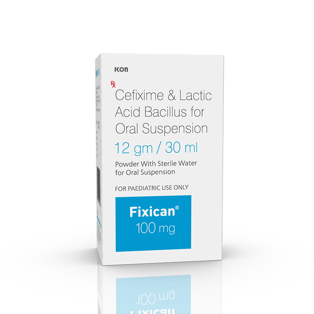 Fixican 100 mg Dry Syrup works through a dual mechanism. Cefixime, a broad-spectrum antibiotic, inhibits bacterial cell wall synthesis, effectively killing or inhibiting the growth of susceptible bacteria to treat infections. Lactic Acid Bacillus, a probiotic, restores and maintains healthy gut flora, helping prevent antibiotic-associated diarrhea and supporting digestive health. Together, they treat bacterial infections while maintaining intestinal balance.