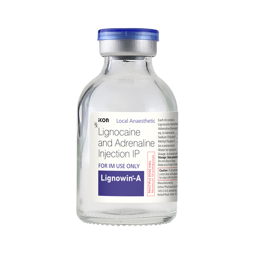 Lignowin-A Injection is a combination of two medicines: Lidoacaine and Adrenaline. Lidocaine is a local anesthetic which works by blocking pain signals from the nerves to brain thereby decreasing the sensation of pain. Adrenaline is a vasoconstrictor which tightens the blood vessels to slow the dispersal, and thereby prolong the effect of Lidocaine. Together, they numb the area effectively and allow medical procedures/surgeries to be performed without pain.