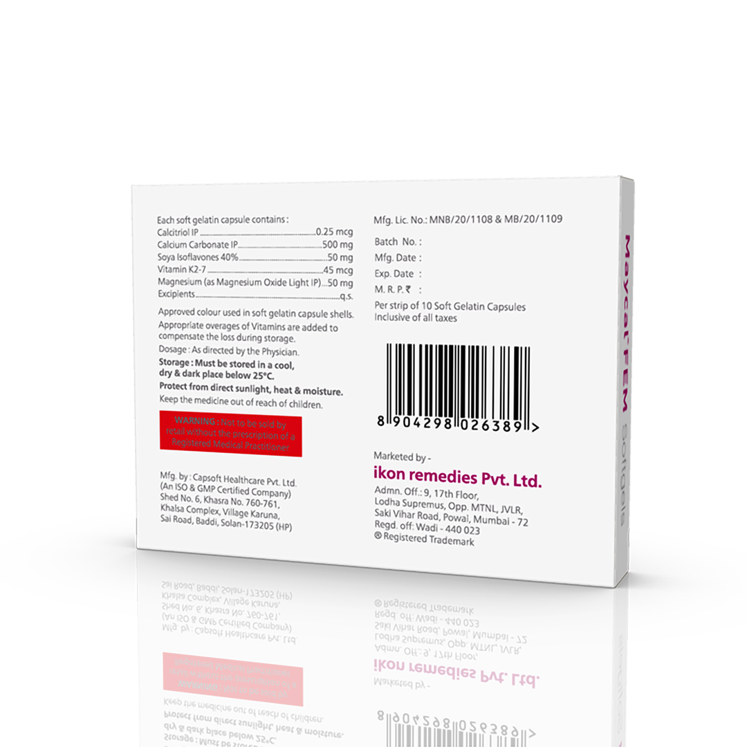 Maycal-Fem Softgels is a combination of vitamins, minerals, and dietary supplements. Calcitriol works by helping the body utilize more of the calcium present in ingested foods or supplements and regulating the body’s production of parathyroid hormone. Calcium carbonate works in the blood by preventing or treating negative calcium balance seen in low serum calcium conditions. Calcium is required for healthy muscles, bones, the nervous system, and the heart. Magnesium oxide is a mineral supplement essential for bone mineralization and the formation of the bone matrix. Soy isoflavones exhibit numerous biological functions, such as antioxidant, inhibitory on cancer cell proliferation, anti-inflammatory, prevention of coronary heart disease, and osteoporosis. Vitamin K2-7 supplementation helps in ameliorating peripheral neuropathy, reducing bone fracture risk, and improving cardiovascular health.