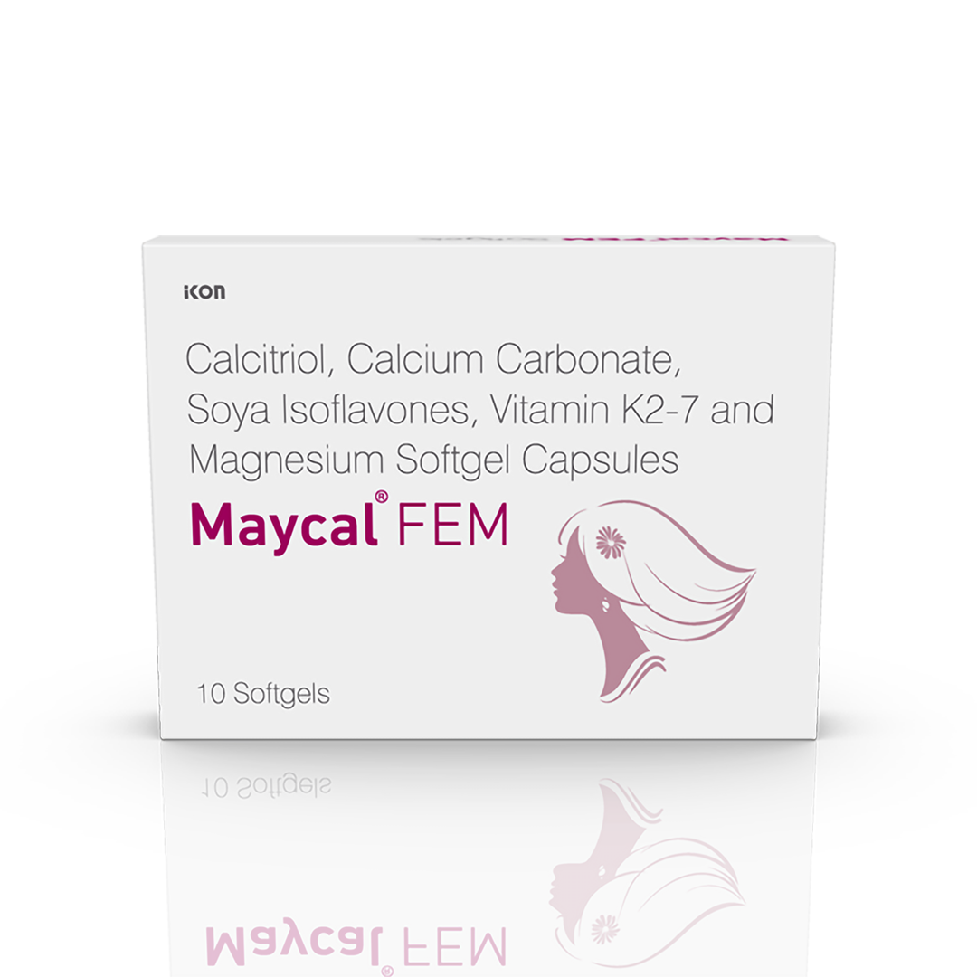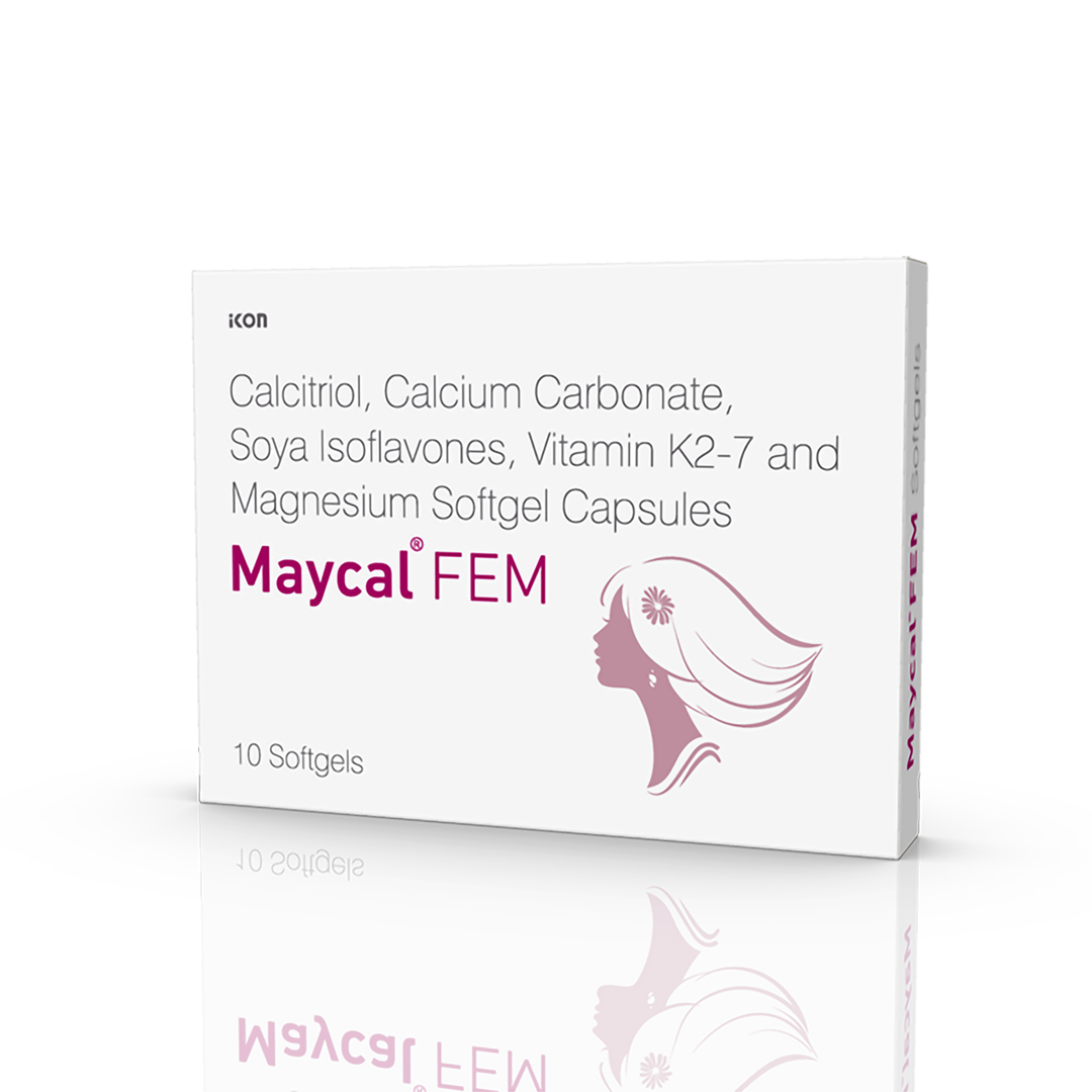 Maycal-Fem Softgels is a combination of vitamin and mineral supplements used to treat nutritional deficiencies in the body. It ensures the proper growth and functioning of the body, supports bone health, prevents calcium deficiency, and helps in conditions like osteoporosis, weak bones, and vitamin D deficiency.