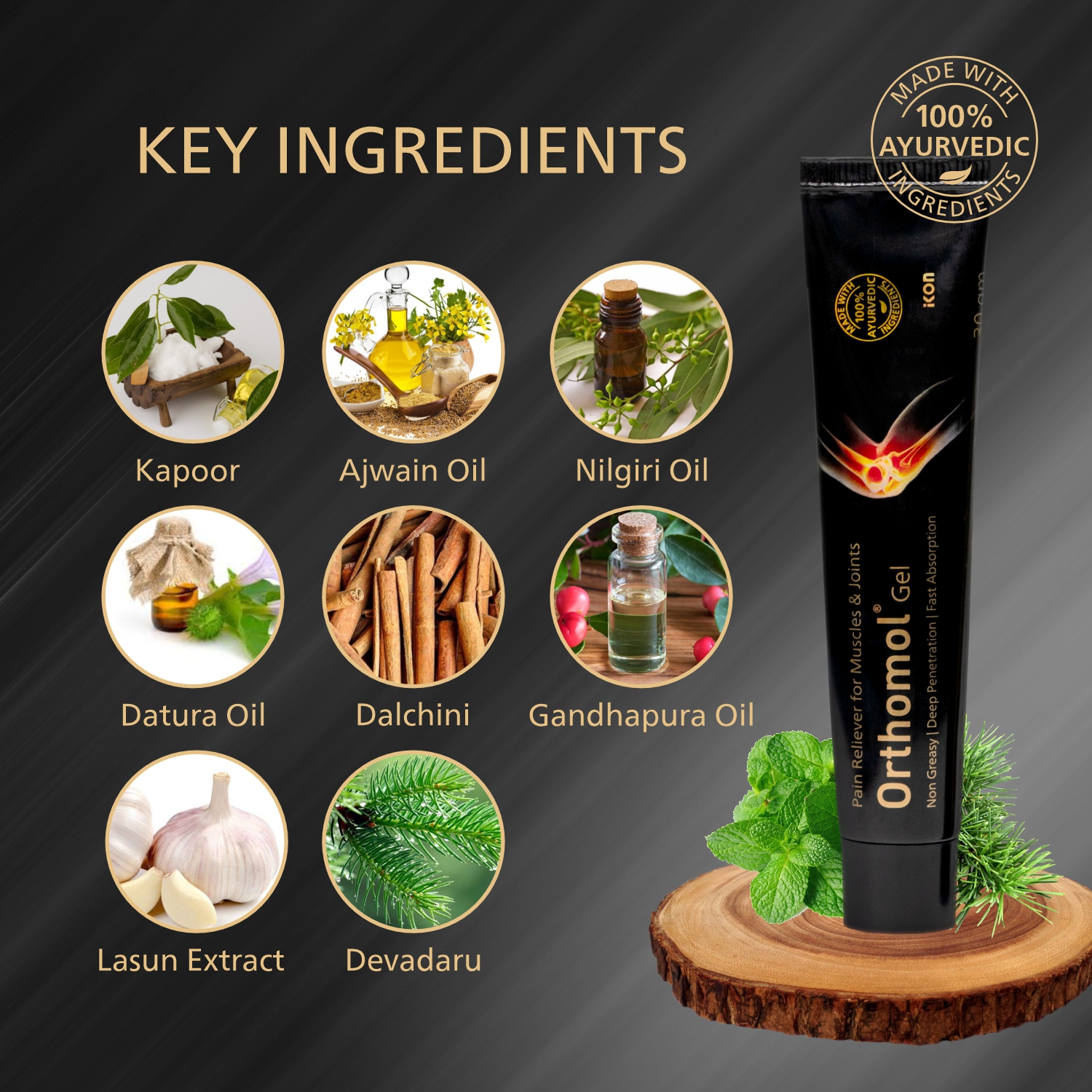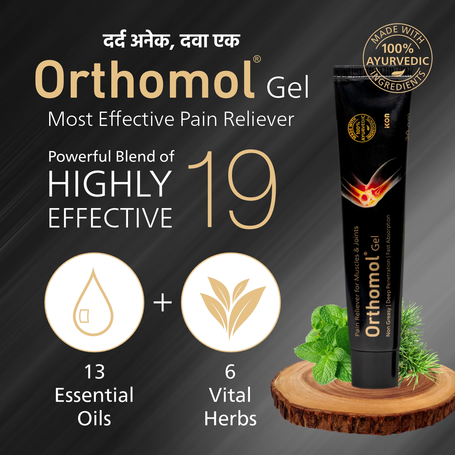 Orthomol Gel is an authentic pain-relieving gel rooted in the great heritage of Ayurveda, the ancient Indian science of medicine & health. Orthomol Gel is a unique combination of 6 vital bone-nourishing herbs and 13 pain-relieving essential oils, such as Mahanarayan & Mahavishgarbh Oil.