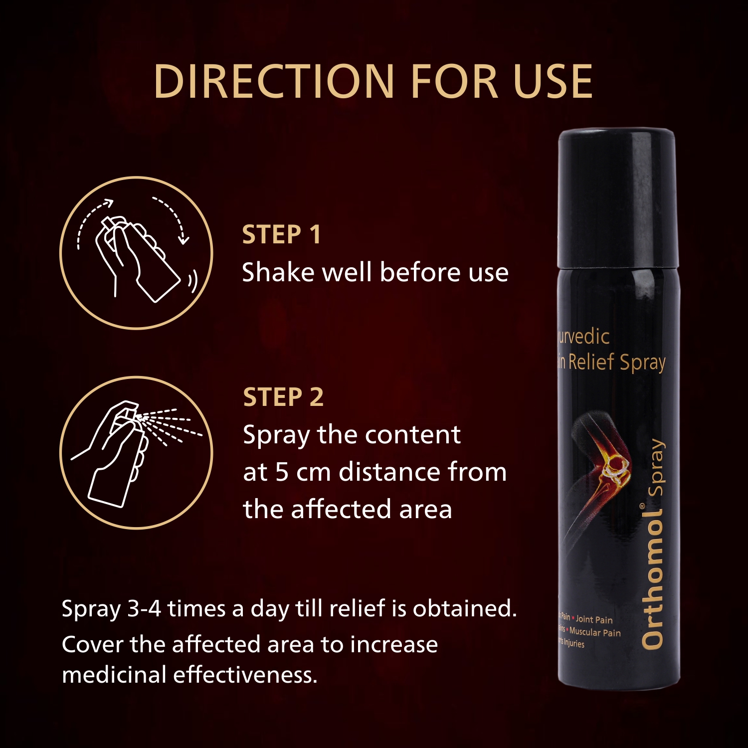Made with 100% pure & natural Ayurvedic herbs, Orthomol Spray works quickly over the affected area and ensures proper blood circulation, and provides immediate warmth & relief to tired and overworked muscles.