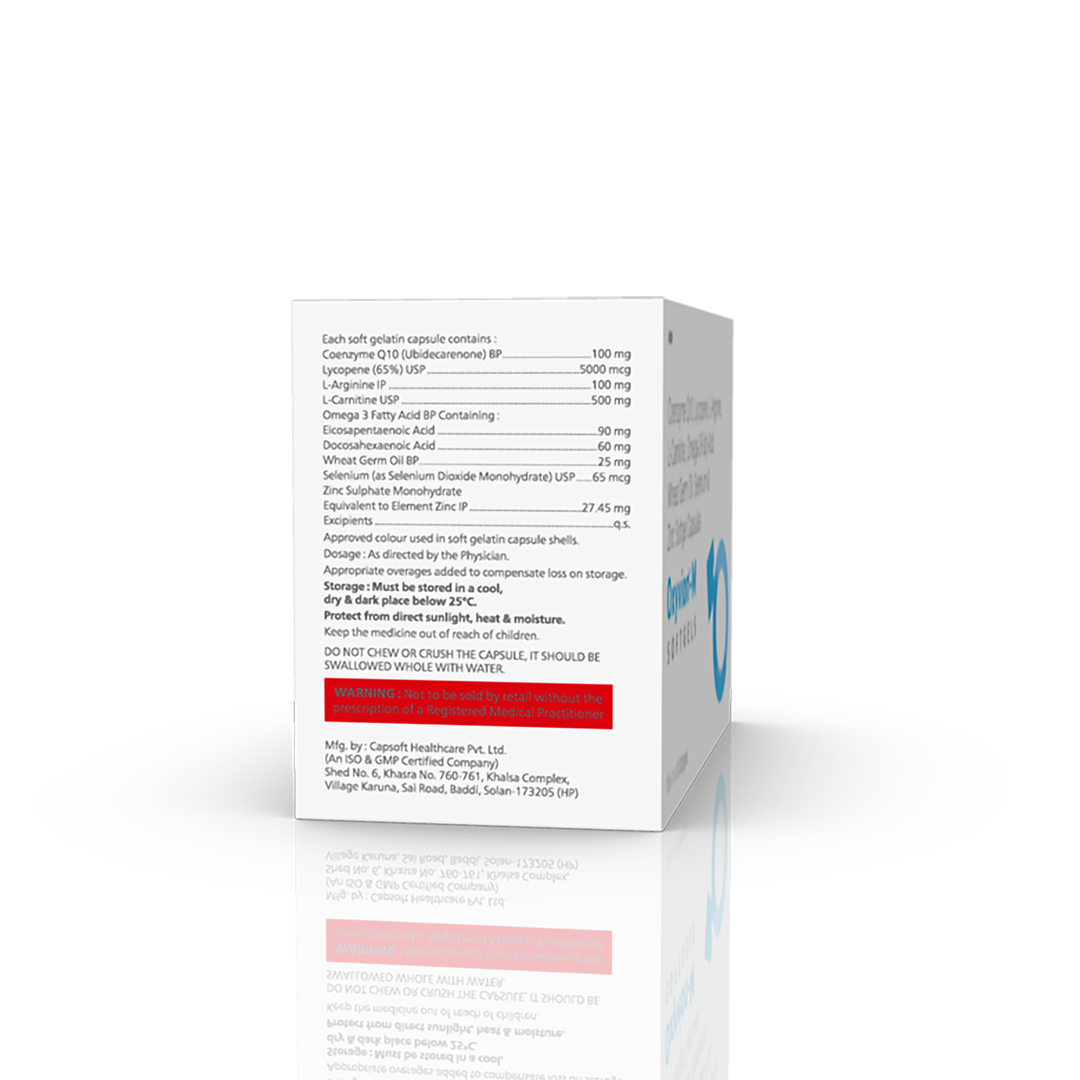 Composition : Male Infertility - Omega 3 Fatty Acid Containing Eicosapentaenoic Acid 90 mg Docosahexaenoic Acid 60 mg, Coenzyme Q10 (Ubidecarenone) 100 mg, Lycopene (65%) 5000 mcg, Selenium (as Selenium Dioxide Monohydrate) 65 mcg, Wheat Germ Oil 25 mg, L-Arginine 100 mg, L-Carnitine 500 mg, Zinc Sulphate Monohydrate Equivalent to Element Zinc 27.45 mg