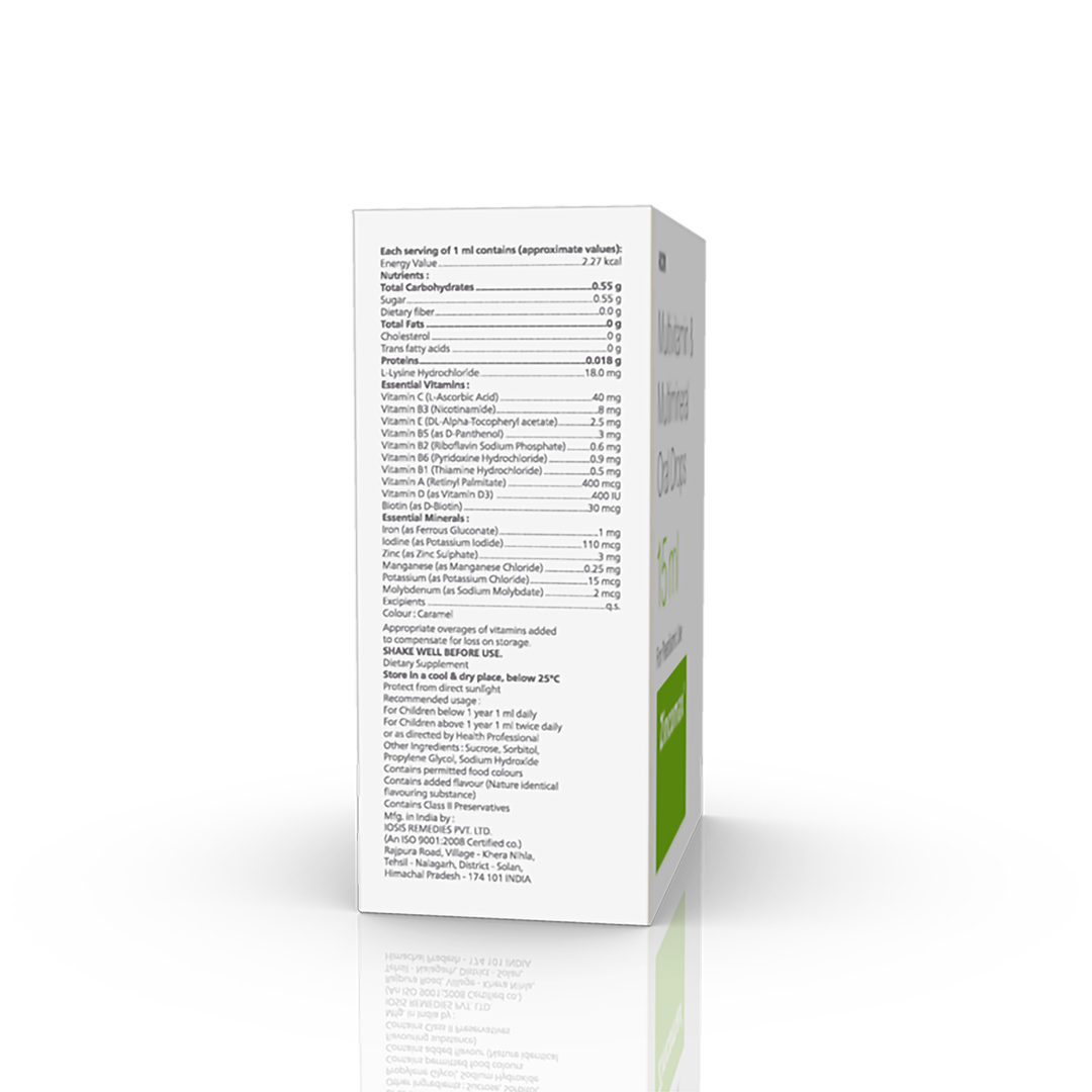 Composition : Multivitamins & Multiminerals Oral Drops: - Each ml contains: Vitamin A (as Palmitate) IP 2500 IU, Vitamin E Acetate IP 2.5 IU, Vitamin D3 IP 200 IU, Ascorbic Acid 40 mg, Thiamine Hcl IP 1 mg, Riboflavin Sod. IP 1.5 mg, Pyridoxine Hcl 1.5 mg, Niacinamide IP 10 mg, D Panthenol IP 3 mg, Biotin USP 50 mcg, Lysine hcl USP 18 mg, Zinc Gluconate USP 1 mg, Manganese Chloride USP 0.25 mg, Potassium Iodide IP 50 mcg, Elemental potassium 15 mcg, Calcium Lactate IP 0.25 mg, Ferrous Gluconate IP 0.4 mg, Sodium Molybdate BP 0.18 mg