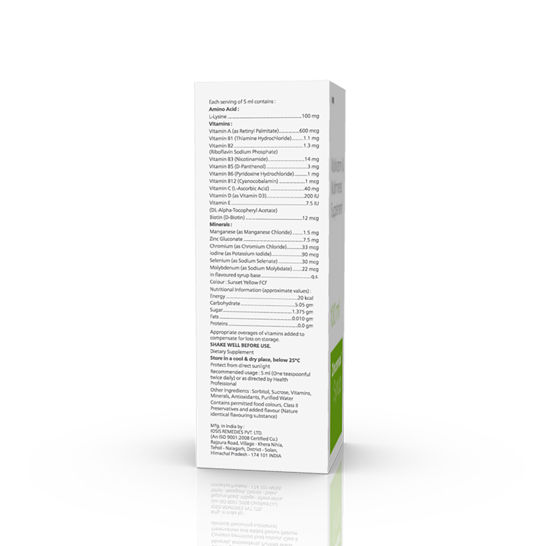 Composition : Multivitamins & Multiminerals Syrup :- Each 5 ml contains: Vitamin A (as Palmitate) IP 2500 IU, Cholecalciferol IP 200 IU, Vitamin E Acetate IP 7.5 IU, Thiamine Hcl IP 2.25 mg, Riboflavin Sod. IP 2.5 mg, Pyridoxine Hcl 1 mg, Cyanocobalamin IP 2.5 mcg, D Panthenol IP 2.5 mg, Nicotinamide IP 22.5 mg, Lysine hcl USP 30 mg, Potassium Iodide IP eq. to Iodine 50 mcg, Copper sulphate USP 100 mcg, Zinc sulphate IP 22.2 mg, Manganese Chloride USP 1 mg, Sodium Molybdate BP 8 mcg, Sodium Selenate eq. to elem. selenium 10 mcg, Ascorbic Acid 40 mg, Chromium chloride USP 8 mcg, Calcium lactate pentahydrate 1.25 mg Flavoured Syrup base