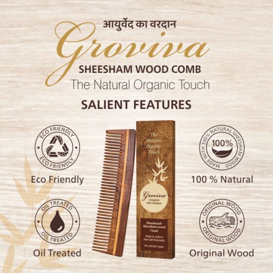 Groviva sheesham wood comb is purely handcrafted from a single strong piece of sheesham wood by the skilled artisans. It is especially good for skin and hair, and a perfect tool to complete your daily hair-care regimen. The wooden teeth have rounded tips that have a gentle massaging effect on your scalp.