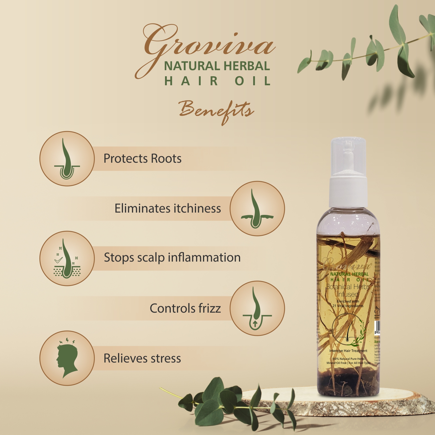 Groviva Natural Herbal Hair Oil has quick absorption over the scalp and provides an intensive hair & scalp treatment that not only controls hair-fall effectively from the very first application, but also takes care of all other issues like hair damage, thinning, dandruff, itchiness, premature greying, dry & frizzy hair, and split ends effectively. Groviva Natural Herbal Hair Oil also helps in controlling sebum production in the hair follicles and promotes hair growth. Groviva Natural Herbal Hair Oil is more than just an oil; it is a complete hair solution.
