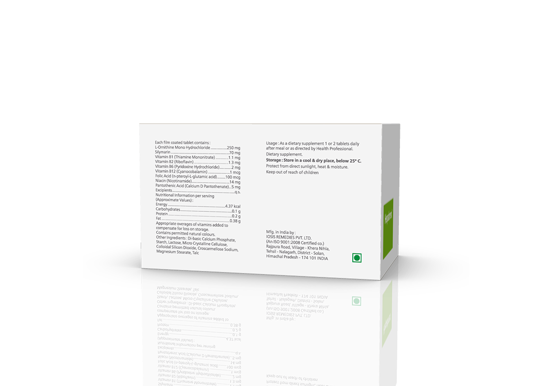 L-Ornithine Mono HCL 250 mg, Silymarin 70 mg, Vitamin B1 1.1 mg, Vitamin B2 1.3 mg, Vitamin B6 2 mg, Vitamin B12 1 mcg, Folic Acid 100 mcg, Niacin 14 mg & Pantothenic Acid 5 mg