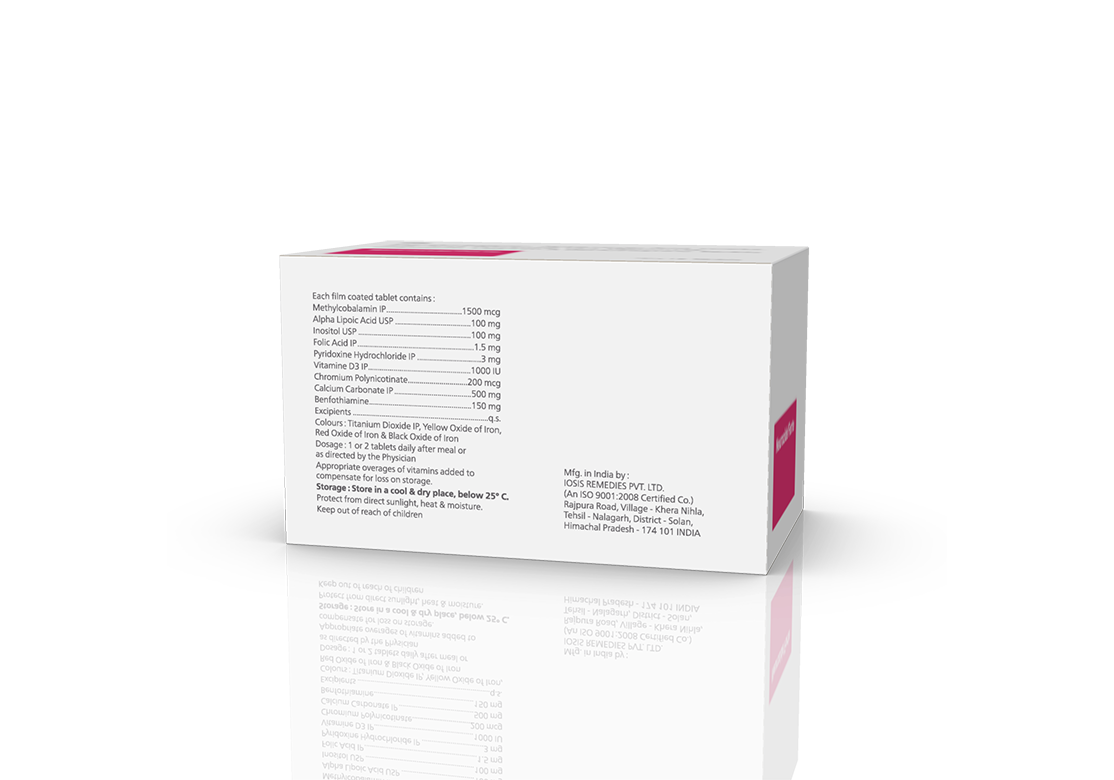 Methylcobalamin 1500 mcg, Alpha Lipoic Acid 100 mg, Inositol 100 mg, Folic Acid 1.5 mg, Pyridoxine 3 mg, Vitamine D3 1000 IU, Chromium Polynicotinate 200 mcg, Calcium Carbonate 500 mg & Benfothiamine 150 mg